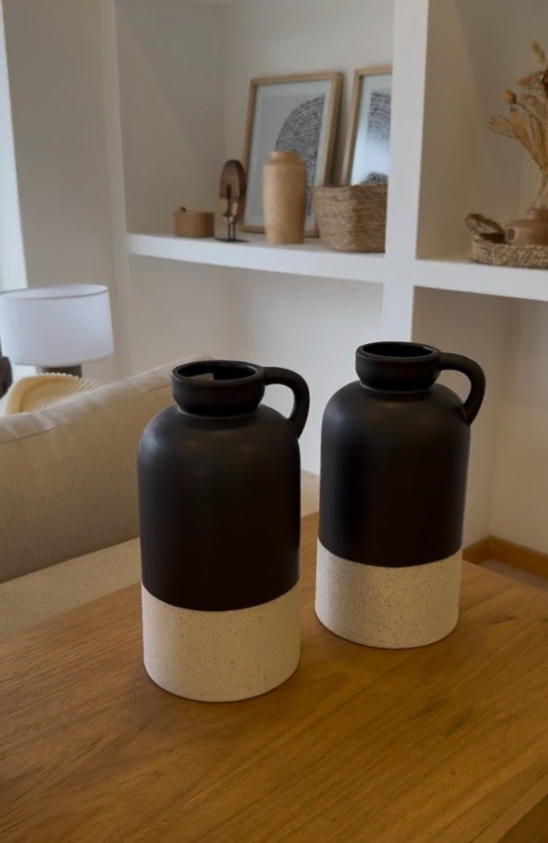 Su diseño presenta una parte superior en negro mate que aporta profundidad y carácter, combinada con una base en tono claro con textura, generando un contraste equilibrado que lo vuelve una pieza muy versátil dentro de la decoración.